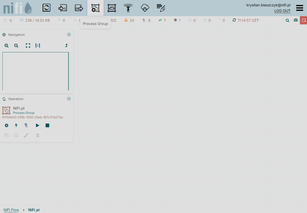 Zaczynamy od stworzenia Process Group oraz dodania go do NiFi Registry, w celu wersjonowania zmian. W tym celu z górnego Menu wybieramy ikonkę o nazwie Process Group i przeciągamy na Canvas, wpisujemy nazwę i klikamy Add.